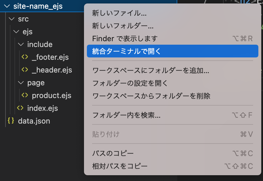 Webサイトのフォルダで【右クリック → 総合ターミナル】を押します。