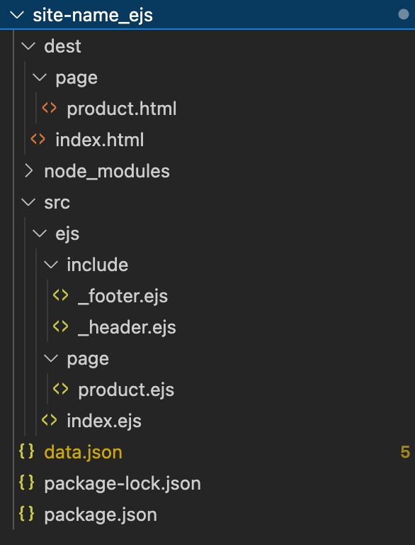 普段使っている HTMLファイルの拡張子を .ejsに書き換えて、↑ 画像のようにします。